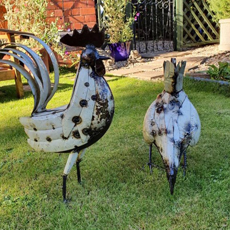Our white Hen sculpture now has a pecking partner! Created using reclaimed panels from fridges and washing machines to create a feathered effect.